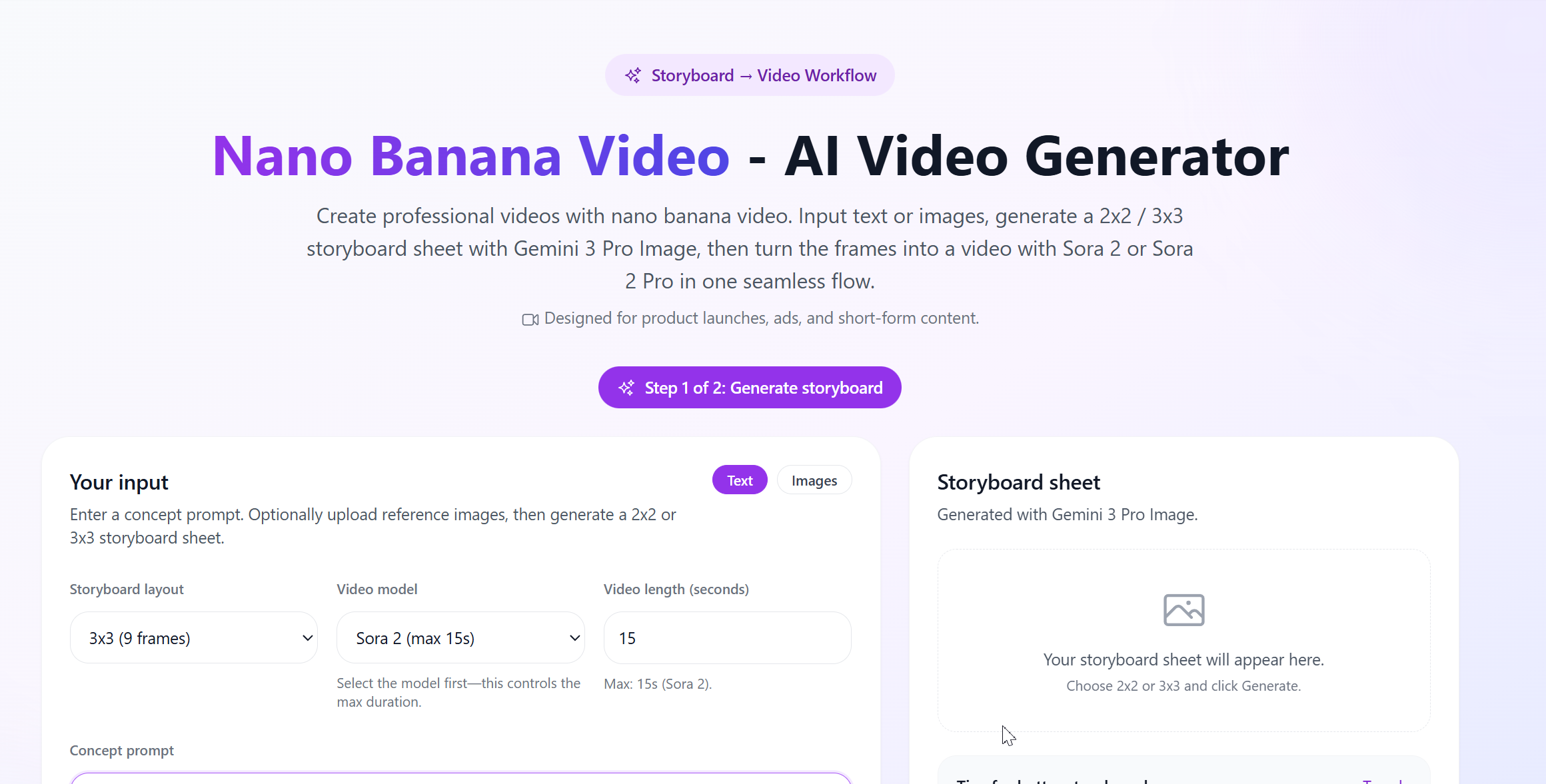 Create professional videos with nano banana video. Input text or images, generate a 2x2 / 3x3 storyboard sheet with Gemini 3 Pro Image, then turn the frames into a video with Sora 2 or Sora 2 Pro in one seamless flow.