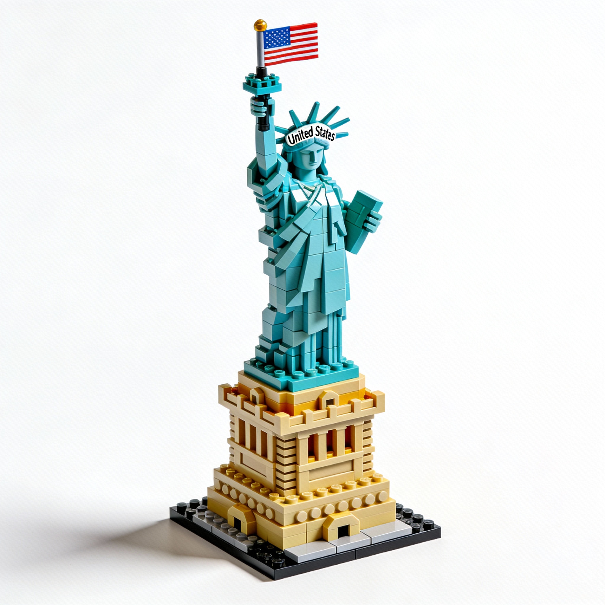 A vertical LEGO diorama showing [LANDMARK], [COUNTRY]). The scene is built entirely from LEGO bricks. A small [COUNTRY] flag is positioned at the top of the structure. Use a plain white background with a subtle shadow cast by the structure. 3D rendered, high-resolution