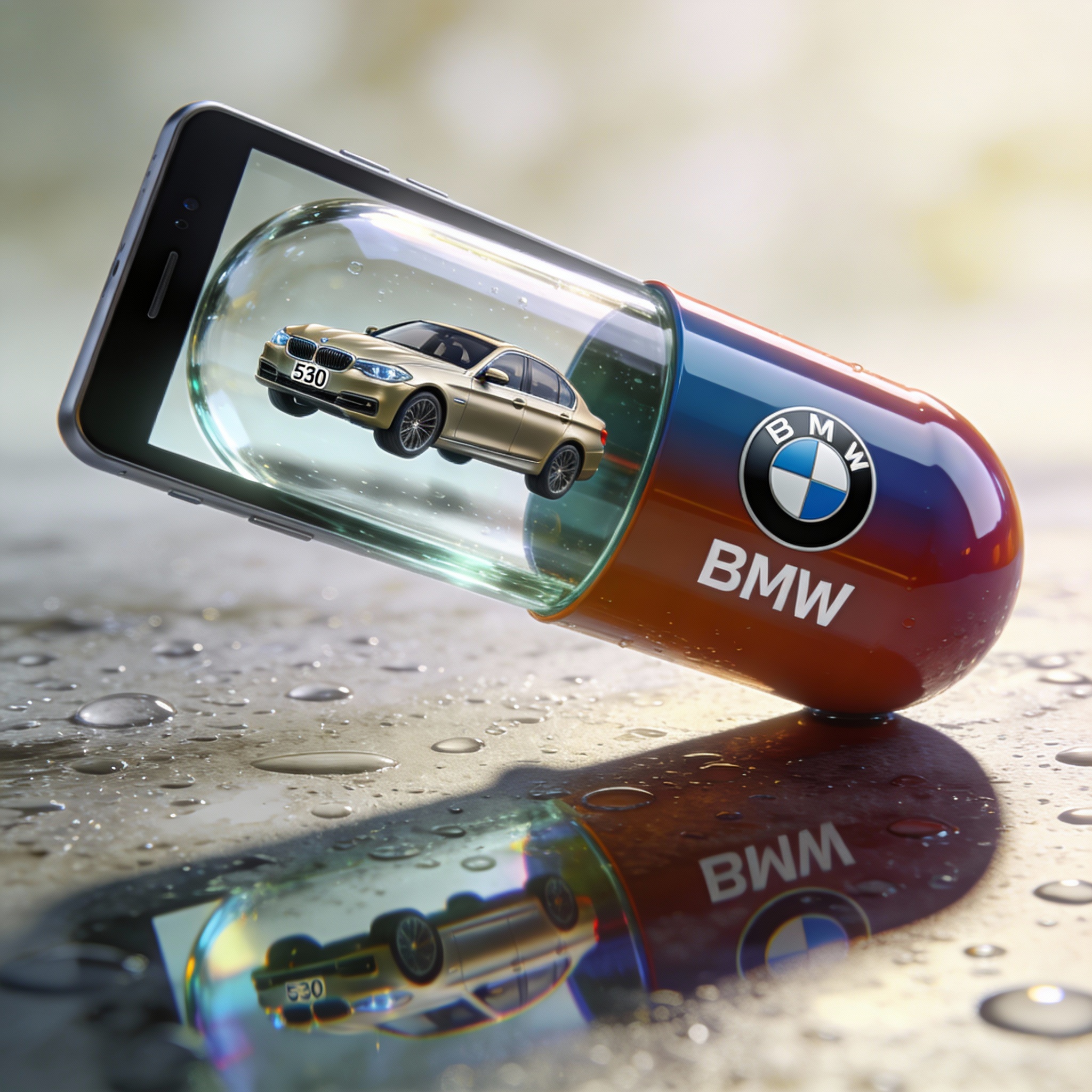 Create a hyper-realistic stylish poster featuring a horizontal tablet-capsule hovering above a surface with condensation and water droplets. One side is transparent glass, the other is glossy colored plastic with [BRAND] logo and name. Inside the glass portion floats a photorealistic 3D model of [CAR MODEL], perfectly centered and suspended. Glass and plastic surfaces showcase strong reflections, refractions, and distortions. Background is softly blurred elegant light-toned setting. Dynamic perspective with stylish camera angle, professional studio lighting, ultra-high detail. DSLR-quality with impeccable realism. 1080x1080 aspect ratio.