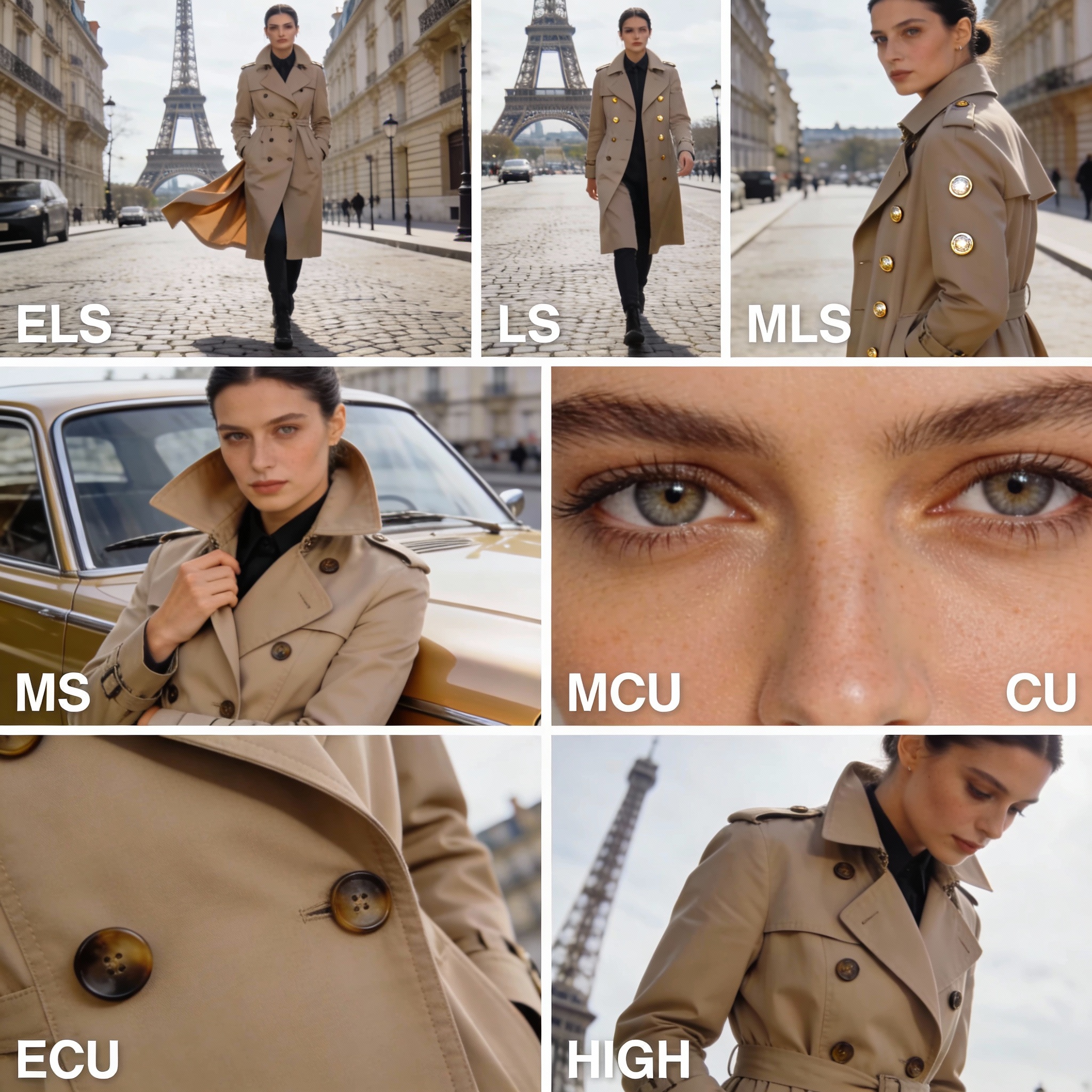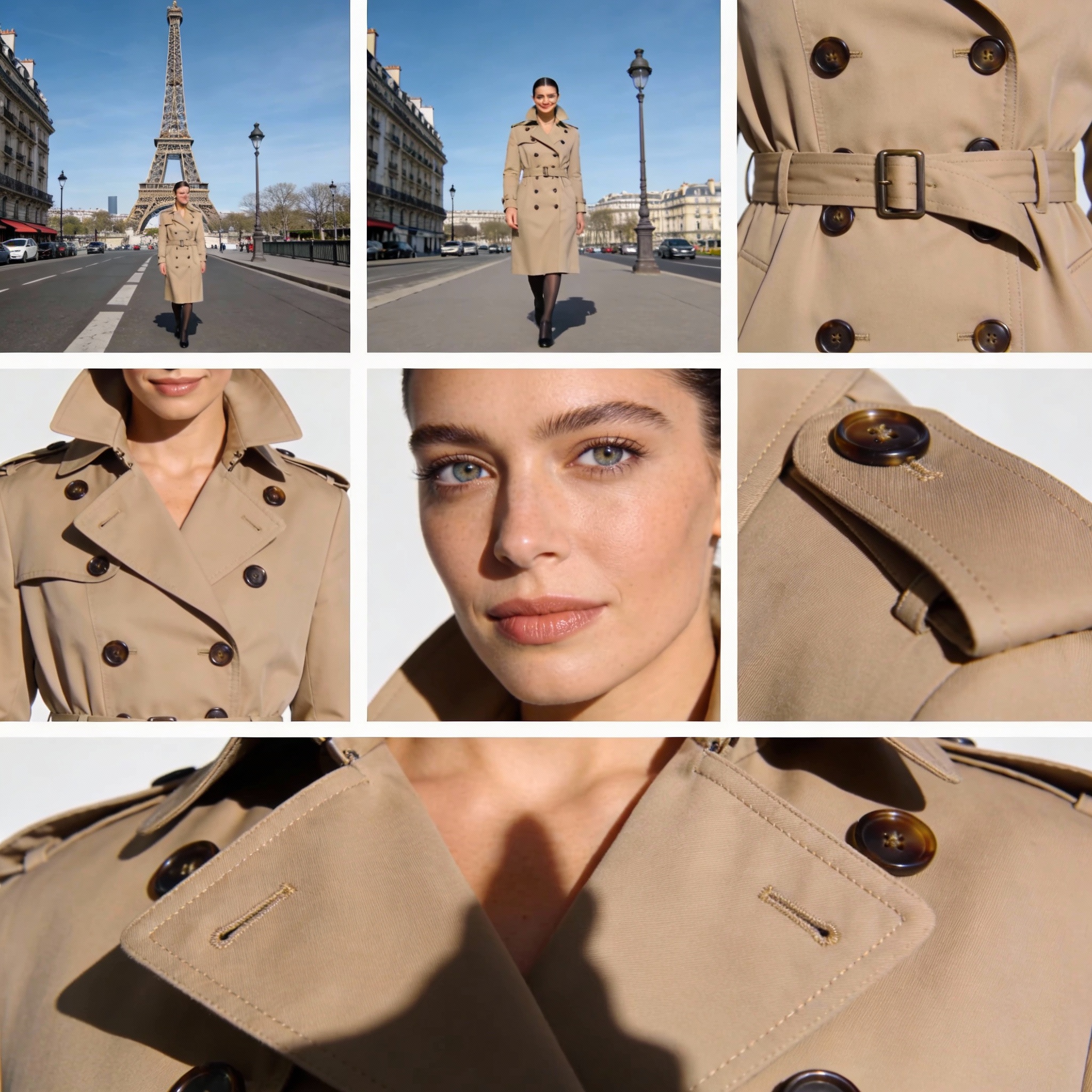Generate a 3x3 cinematic storyboard grid. One consistent female model, same outfit, same lighting. Theme: French high-end double-breasted trench coat. Camera shots sequence: Row1: ELS, LS, MLS | Row2: MS, MCU, CU | Row3: ECU (details), Low Angle Shot, High Angle Shot. Ultra-detailed face, natural skin texture, clear pupil highlights. Premium fashion editorial tone, clean background, luxury e-commerce style.